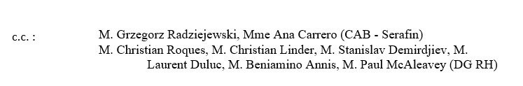 cc: M. Grzegorz Radziejewski, Mme Ana Carrero, M. Christian Roques, M. Christian Linder, M. Stanislav Demirdjiev, M. Laurent Duluc, M. Beniamino Annis, M. Paul McAleavey